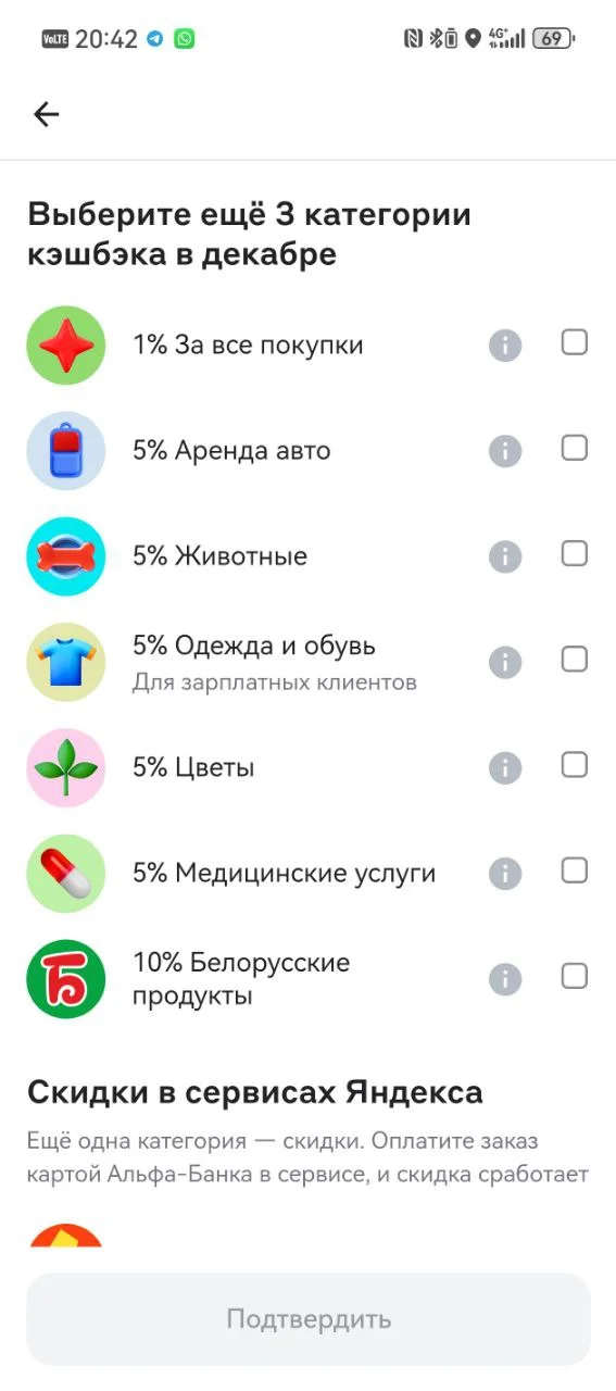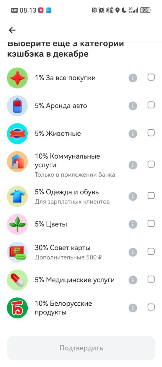 • Категории на выбор: 3 категории, иногда 4-6. Индивидуальный кэшбэк в рандомных категориях (если обычным клиентам до 5% кэшбэка, то для премиальных клиентов обычно до 7%).